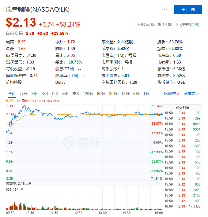 在纳斯达克,瑞幸已经倒地,离“死”只剩下一口气的距离。市值从曾经的百亿美金几近跌没。但5月26日,瑞幸股价大幅反弹,盘中一度飙升逾71.22%,收盘报涨53.24%。