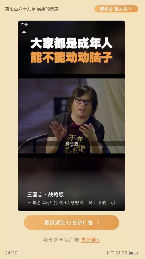 只不过和渣渣辉、鲲、山海经不一样的是,战神归来不是游戏广告,而是一部网络小说的广告——更确切地说是网络小说APP的广告。