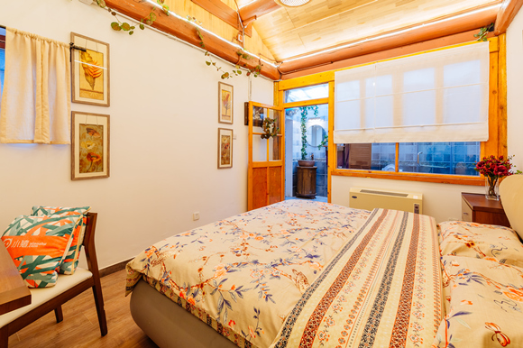 这其实是薛明和短租平台小猪合作开设的花店主题住宿。古色古香的四合院平房大概50多平米,大厅是花店,西侧就是单独的住宿区,放置有一张双人床,整体风格简单清新。如果你通过小猪短租申请到这里住宿,也许还可以跟薛明学习花艺。