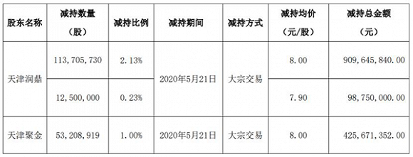 2020年5月21日晚,金科股份发布公告称,天津润鼎物业管理有限公司(下称“天津润鼎”)和天津聚金物业管理有限公司(下称“天津聚金”)以大宗交易的方式分别减持金科股份1.26亿股和0.53亿股。