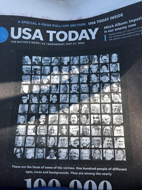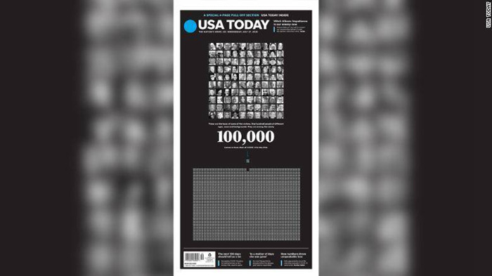 据报道,彩色报纸《今日美国报》这一头版采用黑白设计,印上了100张死者的照片。而在照片下面,加粗的数字“100000”十分醒目。在这100张照片下面还写着:“这些是一些受害者的脸,100个不同年龄、种族和背景的人。”