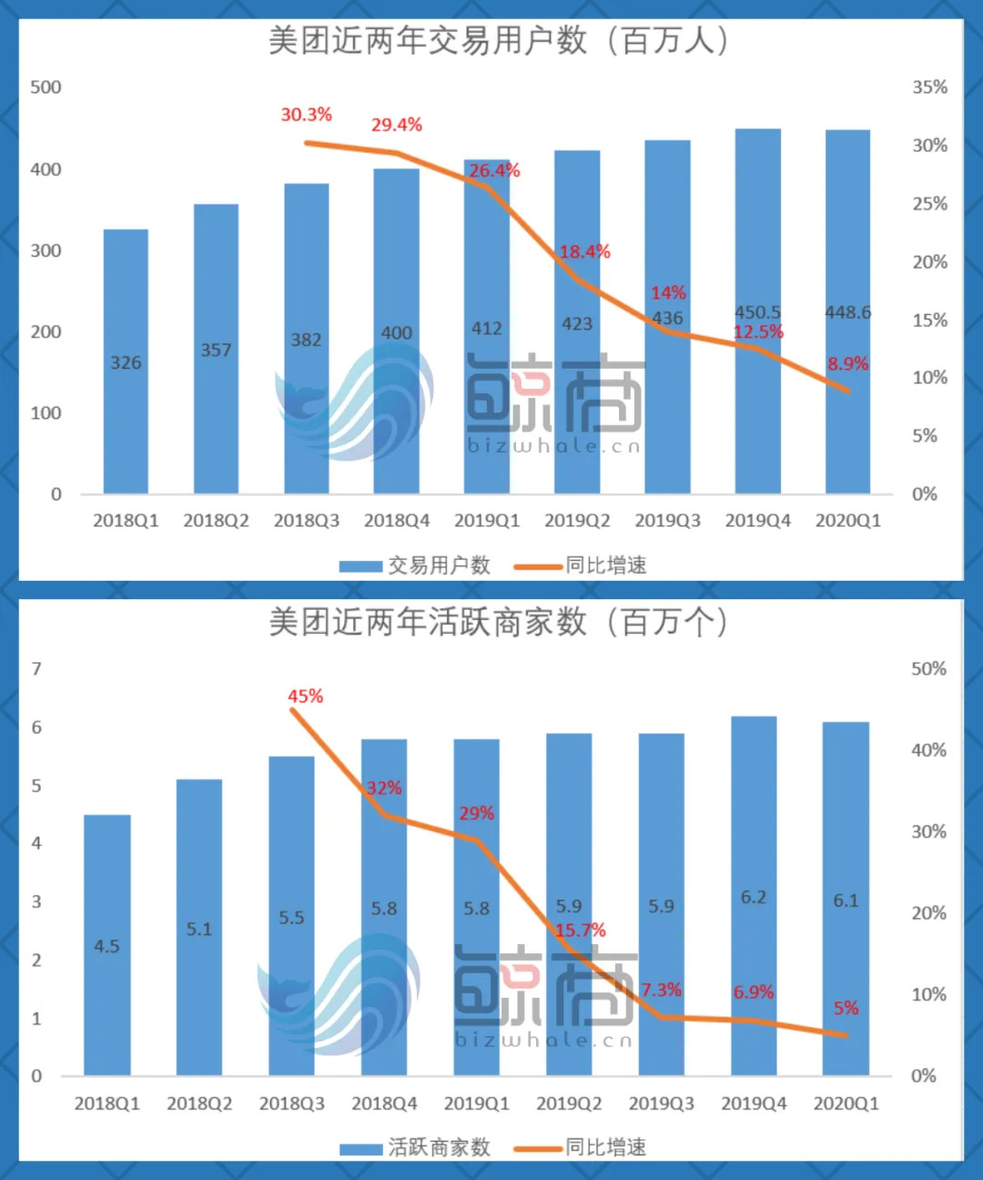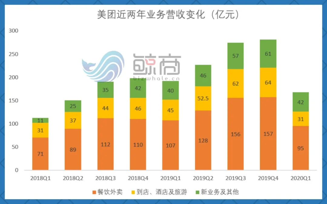 涨佣金风波又加剧了美团与商家之间的隔阂。尽管资本仍旧狂热,但美团今年的日子注定不好过。美团近日发布的2020年Q1财报显示,本季实现营收168亿元,同比下降12.6%,经营亏损达17亿元,经调整后净亏损2.16亿元。其中外卖业务收入同比下降11.4%,到店、酒旅业务收入同比下降约31%。与同处疫情期间阿里、腾讯、京东的增长相比,美团的大幅下跌有点刺眼。