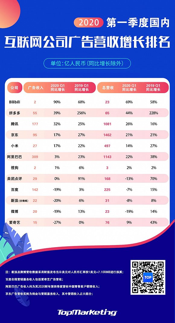 作为经济的晴雨表,广告投放量通常反映了经济走势,特别是在饱受疫情困扰的第一季度,互联网公司的业绩表现对后疫情经济的恢复情况也具有一定的参考价值。为此,TOP君根据各家公司财报整理出了一份国内互联网公司广告营收增长榜单。