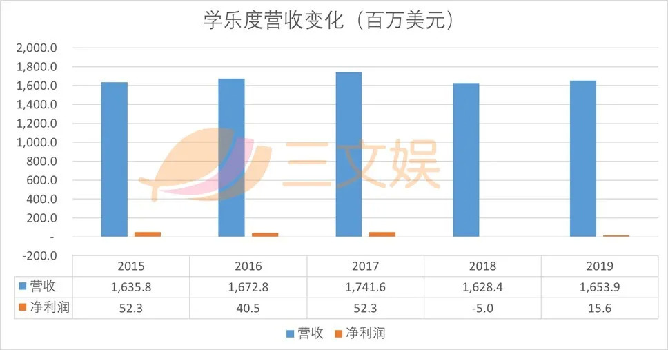 根据学乐公布的2019财年财报,其营收16.5亿美元,同比增长1.6%,净利润1560万美元,去年同期是亏损500万美元。