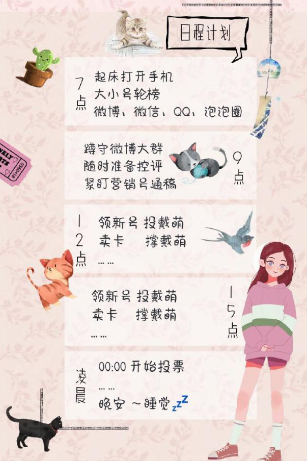 以正在热播的《青春有你2》为例,据不完全统计,粉丝们需要投票助力的榜单有12种,一些选手应援会甚至绘制了漫画版的时刻表,轮榜、控评、投票等任务从早上7点一直安排到晚上11点。