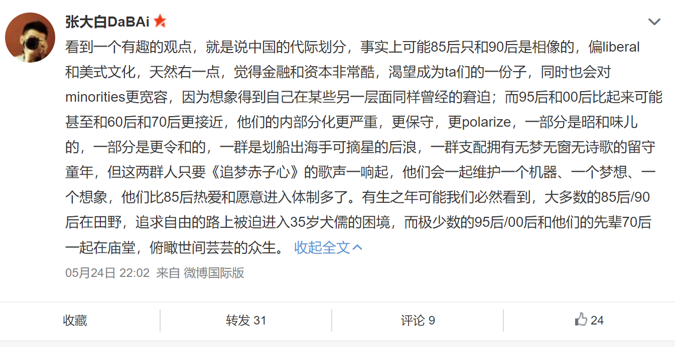 值得一提的是,公众舆论似乎也观测到了这个趋势。甚至提出了一个更激进的观点,认为95后和00后,可能和60后70后更加接近。