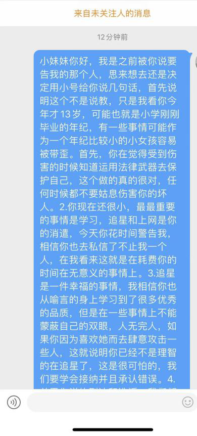 翻看资料时她发现对方只有13岁,一念之间她用小号私信了女孩,私信的内容大体是:每个偶像的背后都有一个粉圈,它是一个比较深的东西,或许对你这个年龄段来说不该去触碰,如果你因为粉圈的事情而生气,指责攻击别人,那赶快抽离出来好好学习。