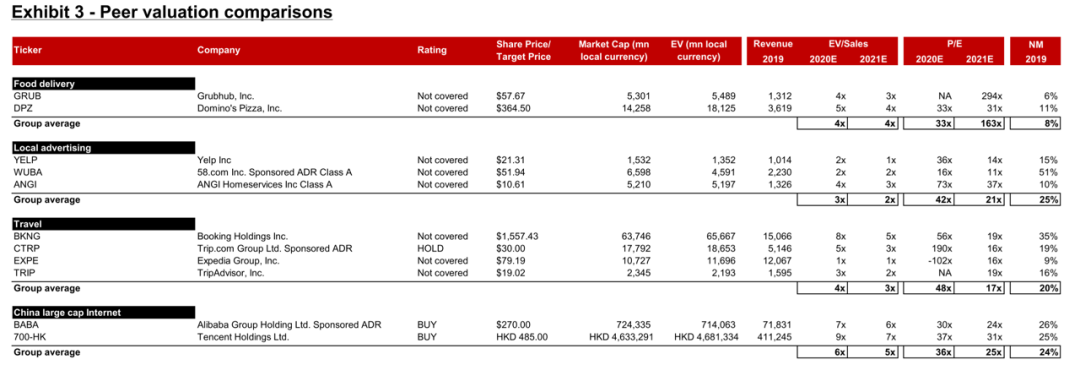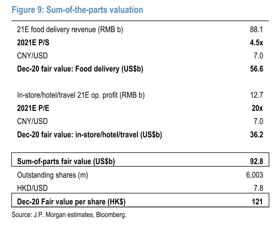 J.P.Morgan对美团外卖业务的估值为4.5倍2021年预期市销率(PS),这比全球其他外卖平台高出10%,因为中国市场增长更快;到店、酒旅业务,J.P.Morgan给出了20倍的2021E P/E,这比携程的PE高出15%,因为美团的盈利能力更强并且不受国际旅行减少的影响。