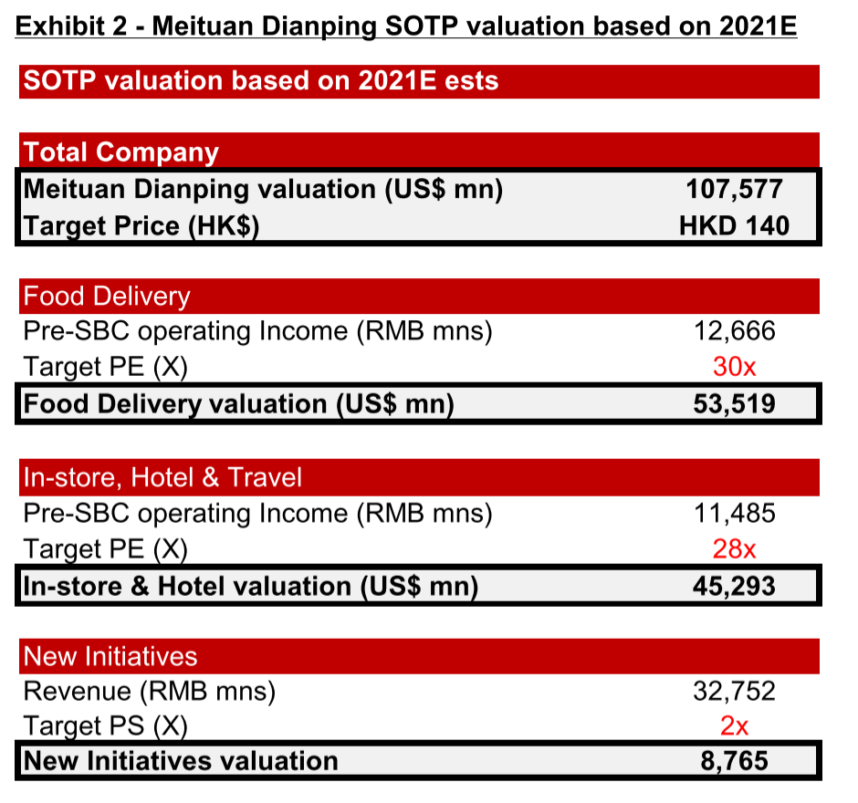 对于新业务,J.P.Morgan给予了保守的零估值,因为这些业务大多数处于早期阶段,并且都亏损,这是二级市场不同于一级市场的核心差异。最终,J.P.Morgan给出了121港元的目标价,目前美团股价高达135港元,显然到极限了。