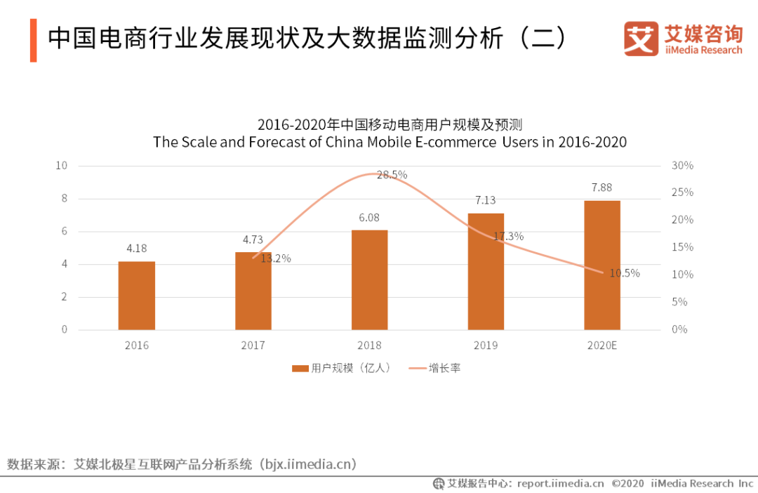 2019年是直播电商井喷的一年,到了2020年,这一势头依旧有增无减。艾媒报告显示,2020年移动电商用户规模有望达到7.88亿人,庞大的直播用户体量是直播电商行业进行商业变现的前提之一,未来直播将成为商家的标配。