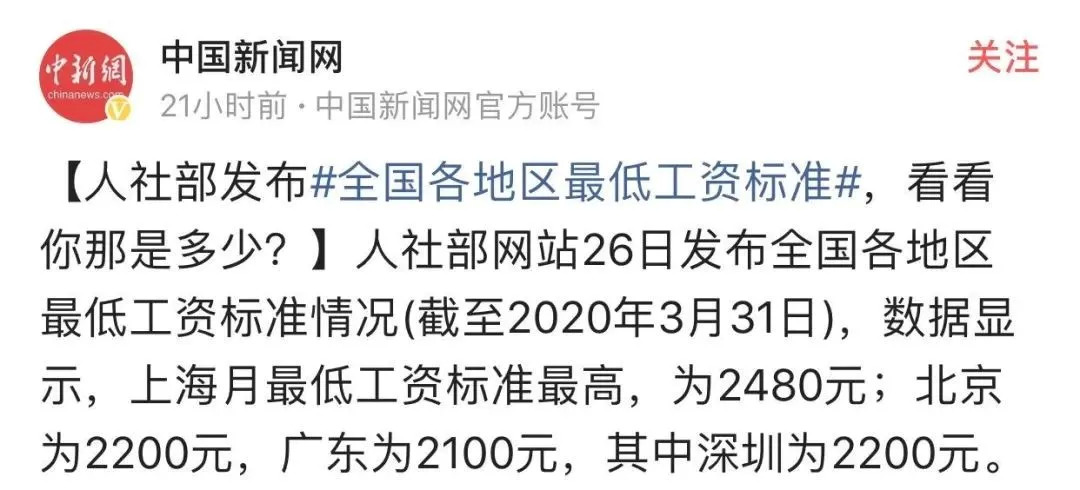 数据显示:上海月最低工资标准最高,为2480元;北京为2200元;广东为2100元。
