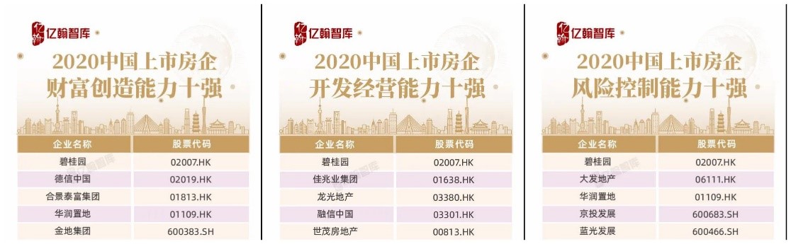 此外,碧桂园还荣获“2020中国上市房企财富创造能力十强”“2020中国上市房企开发经营能力十强”“2020中国上市房企风险控制能力十强”三项榜单的第一名,并入选“2020高信用评级上市房企”前十强。