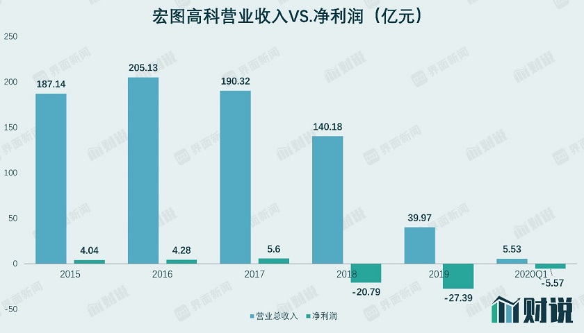 到了2020年一季度,受疫情影响宏图高科持续低迷。当季实现营业收入5.53亿元,同比下降39.06%。归属于上市公司股东的净利润-5.55亿元,同比下降286.56%。同时,公司表示中报的累计净利润预计也为亏损。