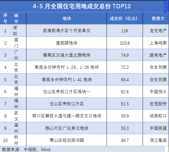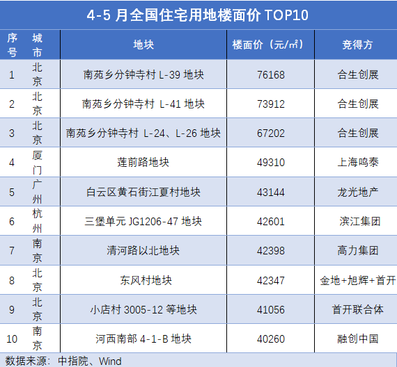 与此同时,根据中指院、Wind 数据统计梳理,4月至今,全国住宅用地楼面价TOP10地块,门槛超过40000元/平方米。
