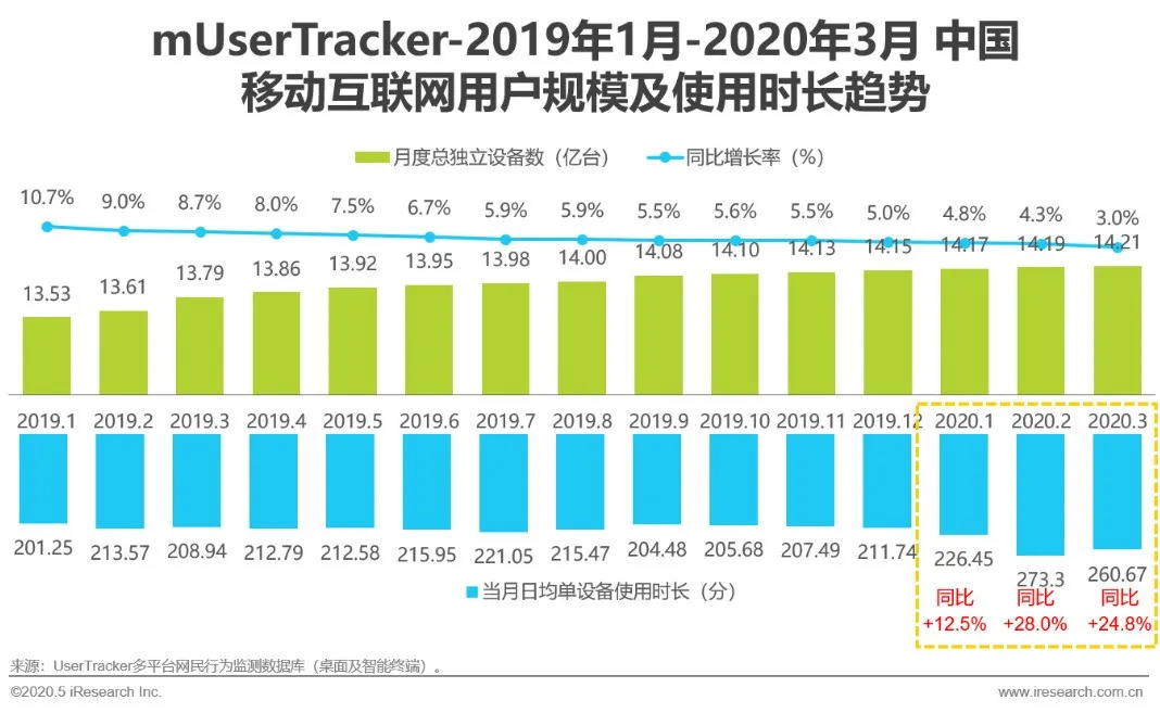 在整体流量日趋饱和的前提下,疫情致使使用时长提升显著