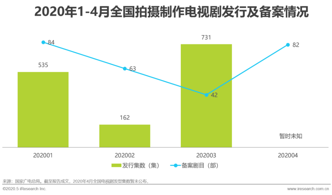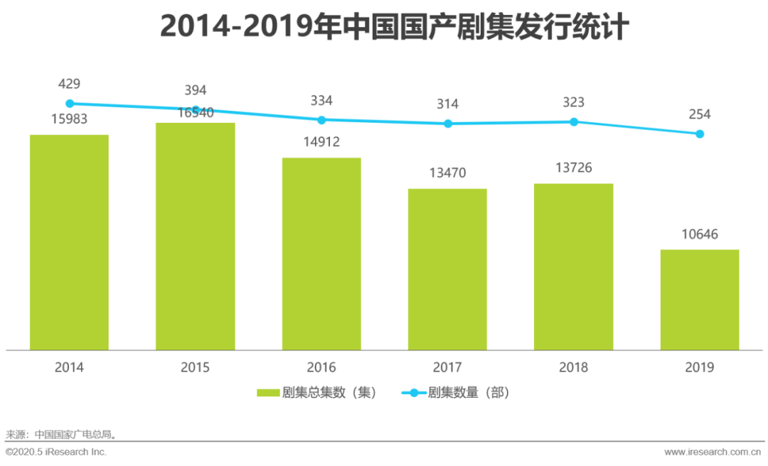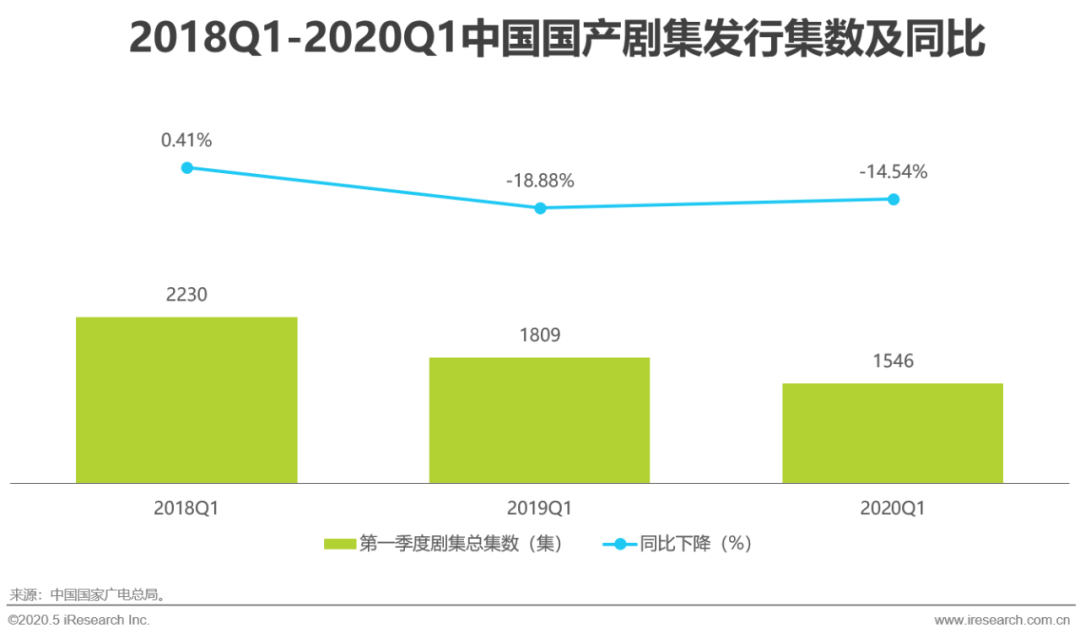 近年来,伴随着政策监管与行业日趋理性,剧集产量连年下降。2019年,全年电视剧集数产量环比下降22.4%,创下历年新低。2020年在疫情的直接影响下,一季度剧集产量集数同比2019一季度继续下滑14.54%。