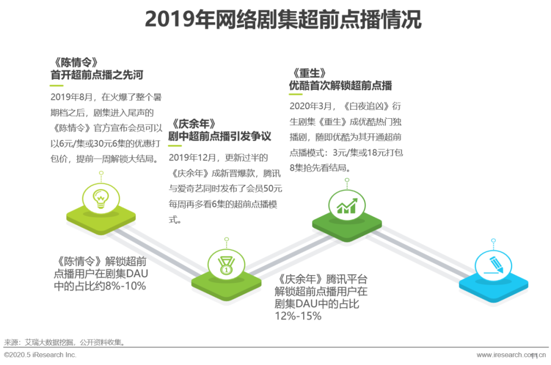 超前点播始于2019年夏的爆款网剧《陈情令》,腾讯视频首开付费超前点播,提前解锁大结局的新模式,随后多部剧集效仿该模式,超前点播结局。年底,《庆余年》在腾讯与爱奇艺两家平台同时上线,两家平台也首次尝试在剧中开启超前点播的模式,引发争议后,后续剧集腾讯视频主要采用抢前先看下周模式,爱奇艺主要采用直通结局模式。今年3月,优酷也首次试水超前点播。2020年1-4月有超6成的头部网剧采用了超级点播模式。