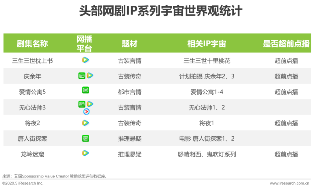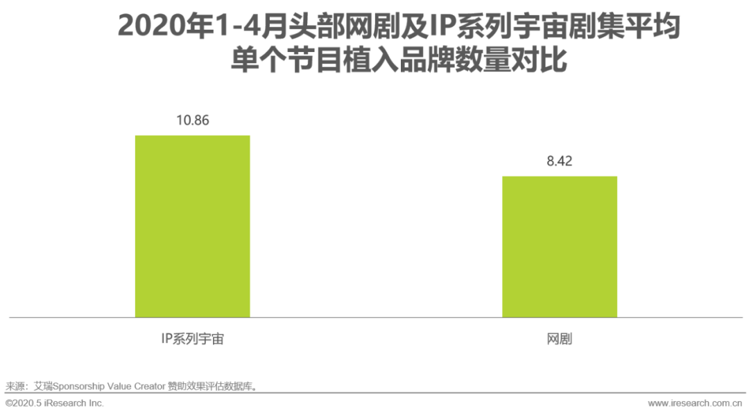 复盘2020年1-4月的TOP20剧集发现,内容端超前点播已成常态,超6成的头部网剧采用超前点播模式。IP改编升级,多部头部剧集拓展出了“IP系列宇宙” 模式。拥有IP系列宇宙世界观的剧集平均单个节目吸引品牌数量较头部网剧平均高出29%。