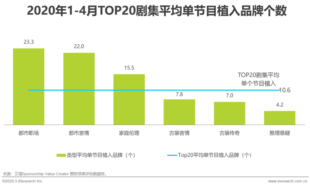 受疫情影响,2020年Q1国内影剧综数量均同比下降,在线视频供应出现短缺。而公众户外活动受限,在线视频使用时长大幅提升,内容供需矛盾凸显。在同期头部综艺数量缩小的前提下,艾瑞SVC监测单个头部节目平均品牌植入数量为4.95,略高于去年同期的4.27。