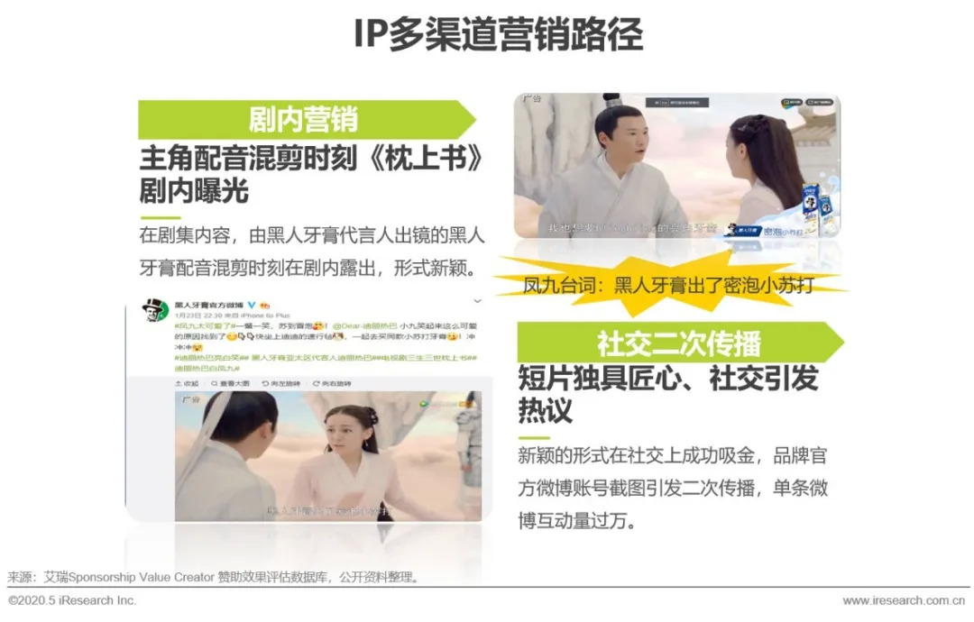 从剧集品牌营销来看,都市剧场景占优,古装剧营销创意优先。综艺门类,“综N代”的IP优势已经显现,内容营销拓展出跨季合作的新方向。随着电商直播的兴起与全域整合营销的成熟,传统的“内容植入”升级为“泛内容营销运营”,具体表现为内容泛娱乐化,营销渠道多元化和直达销售转化的全通路模式。