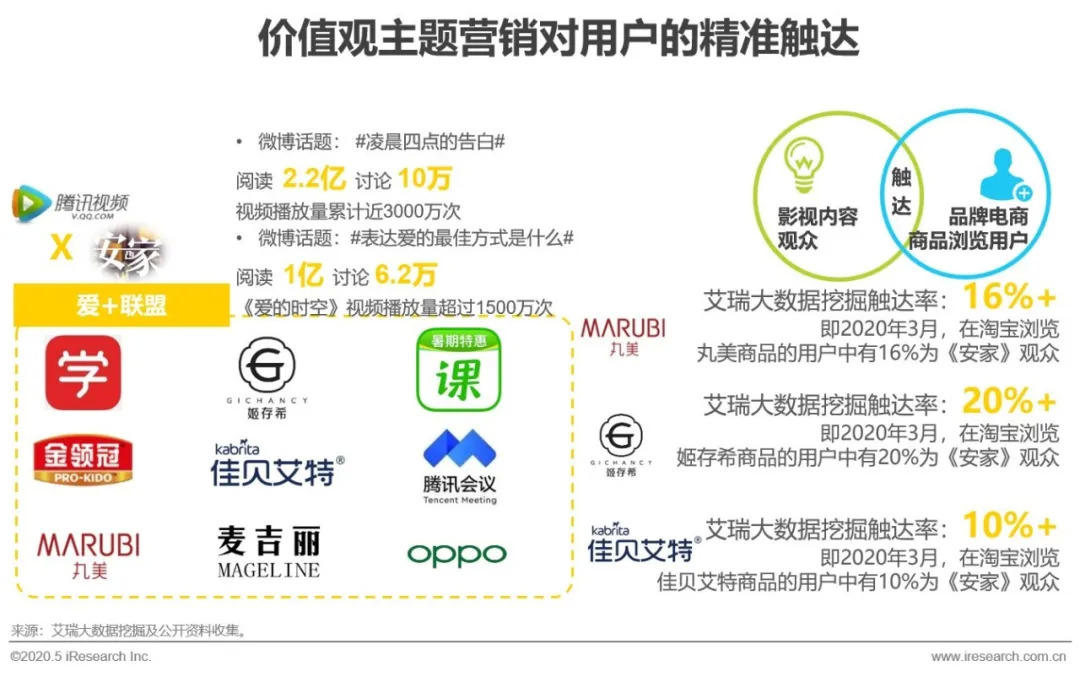 《安家》热播期间,腾讯视频以《安家》为主题联合九大品牌,在剧外多渠道上发起系列整合营销活动,包括“爱+联盟”、“凌晨四点的告白”、主题微电影《爱的时空》等。以温情、守护、爱家等内容价值观赋能品牌,活动辐射剧外多渠道,实现多维传播,驱动共情营销。根据艾瑞大数据挖掘触达率显示,包括丸美、姬存希、佳贝艾特在内的消费品触达率在10%以上。