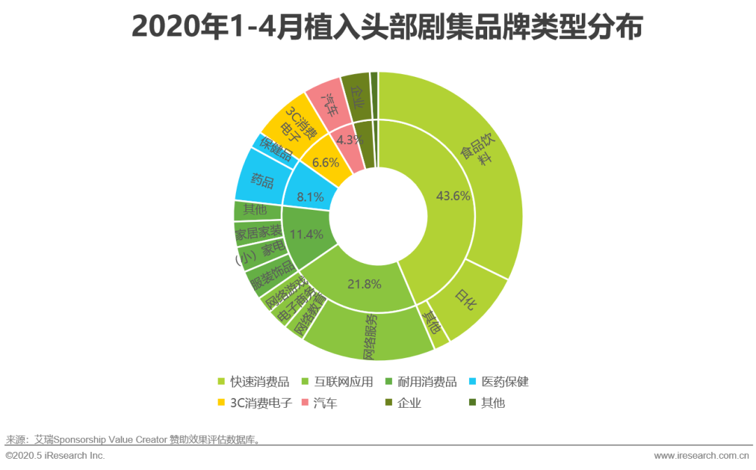 前文提到,疫情期间受到居家隔离的影响,中国移动互联网使用时长暴增,包括在线会议、网络教育在内的多个移动互联网赛道被广泛看好,这也直接刺激了相关品牌主在疫情期间对内容的投放。根据艾瑞SVC的数据,在1-4月的头部剧集投放品牌类型中,互联网应用占比紧随快速消费品之后,整体占比超2成。类似的情况在综艺植入中更甚,1-4月头部综艺中互联网应用类的植入行为占比接近3成。
