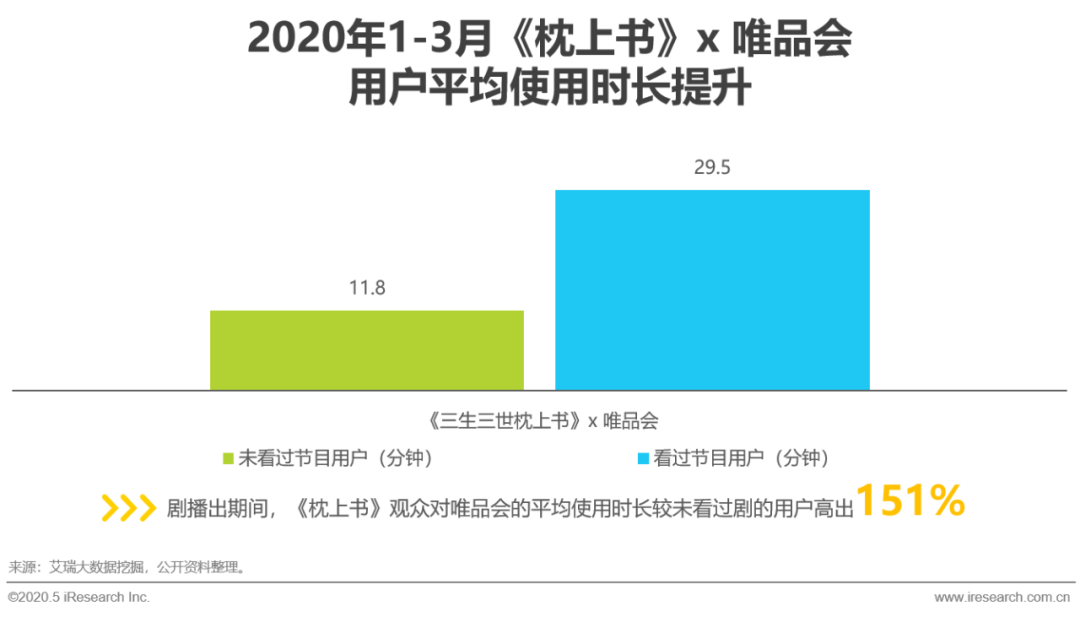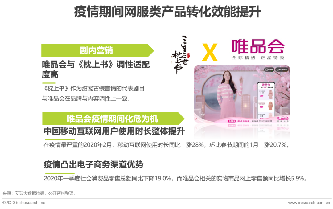 疫情期间,以唯品会为代表的电子商务品类渠道优势凸显,在一季度整体社会消费品零售总额下降的前提下,网上零售额同比上涨,化危为机。而与此同时,品牌进一步与内容共振,迪丽热巴出镜唯品会《三生三世枕上书》明星播报。内容价值与疫情因素叠加,致使疫情期间,《枕上书》观众对唯品会的使用粘性与未看过剧的用户相比进一步提升151%。