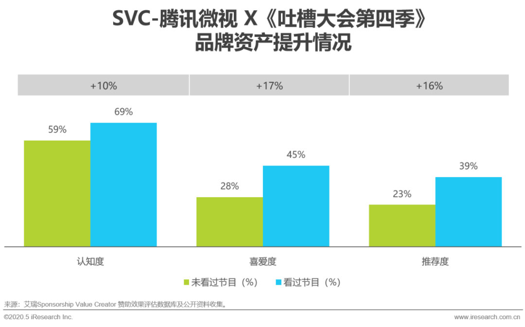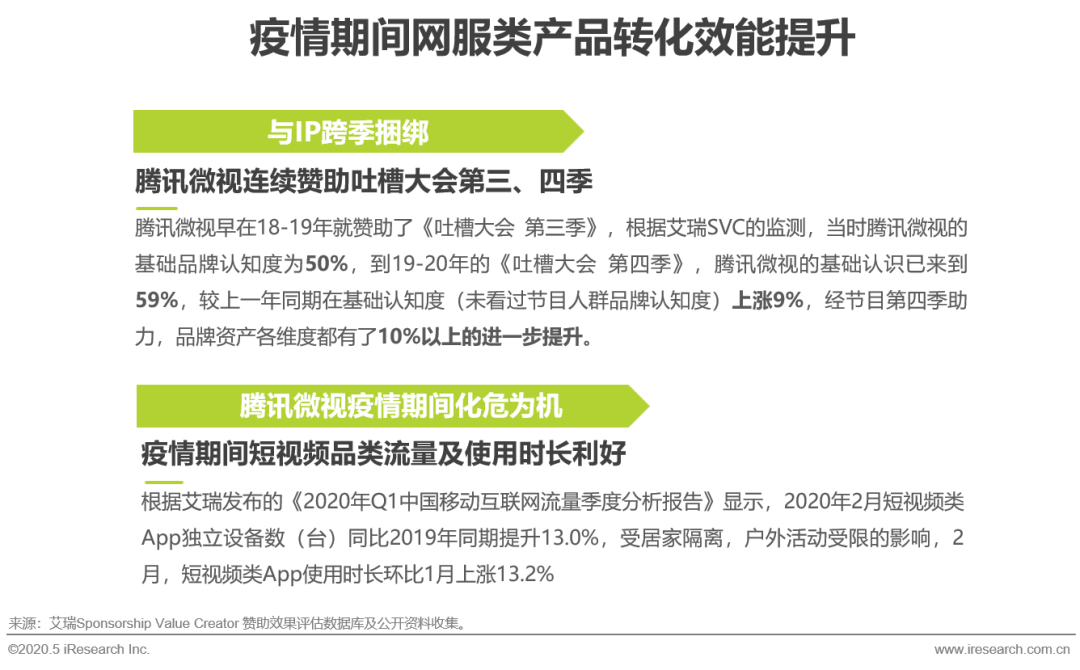 疫情期间,以腾讯微视为代表的短视频类App受客观因素影响,使用时长与流量均有大幅提升。而更值得一提的是“腾讯微视”自2018年赞助《吐槽大会 第三季》以来已连续两季与该内容合作,综N代的IP化效应也由此显现。品牌认知通过两季节目的助力持续拉升,品牌资产表现优异。
