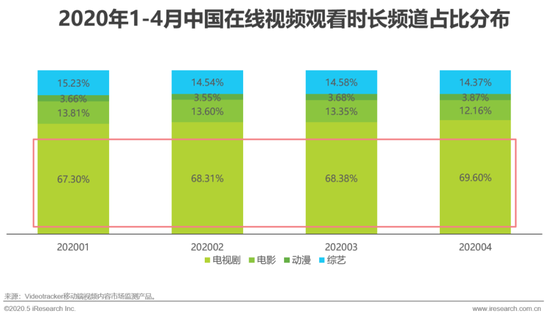 从需求侧来看,2020年4月中国网络影视剧的观看时长占比较疫情期间有更进一步的增长,可见疫情过后用户对影视剧的内容产出保持高粘性的状态。对内容的追看粘性,能够更有效地将内容价值观及内容好感度转嫁给投放品牌。