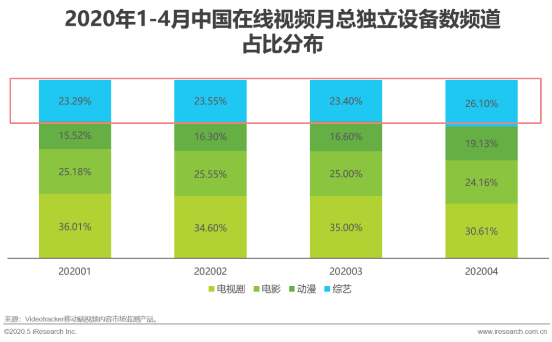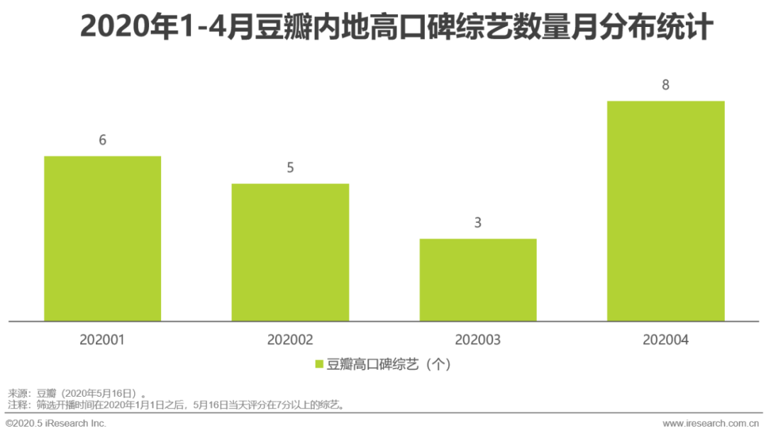 由于综艺边拍边播的特定,2020Q1综艺产能与流量均受到不同程度的影响,疫情爆发于1月下旬,2月大部分综艺仍能维持更新,而到3月,受停工影响大量计划开播的新节目延期,直接导致该月成为豆瓣高口碑综艺的数量低谷。而随着复工复产的到来,4月不论是流量占比,还是高口碑的产出数量均大幅提升,综艺市场回暖。综艺独立设备数占比扩大,代表综艺广告主投放的覆盖人群广度占比提升。