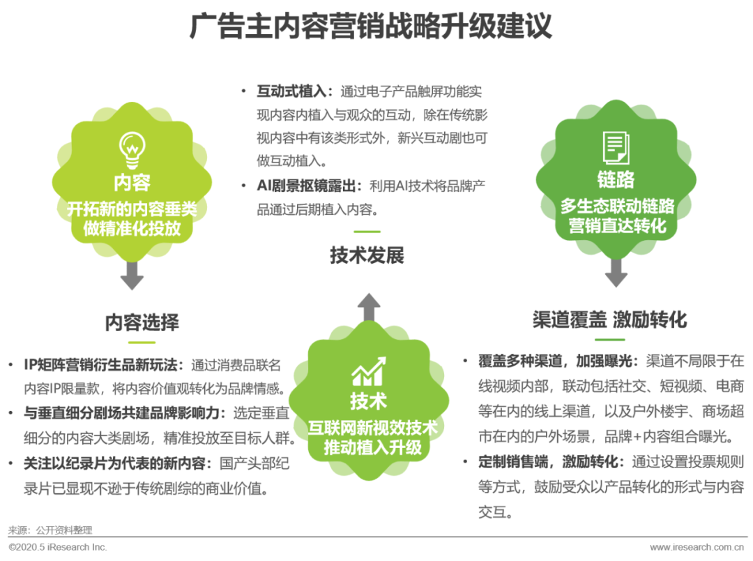 首先,在内容的选择上,艾瑞建议品牌应更多关注IP衍生价值的释放、垂直及集中化圈层的营销方式、以及以纪录片、动漫为代表的新内容的商业价值,做性价比最高的投资及新领域的尝试。