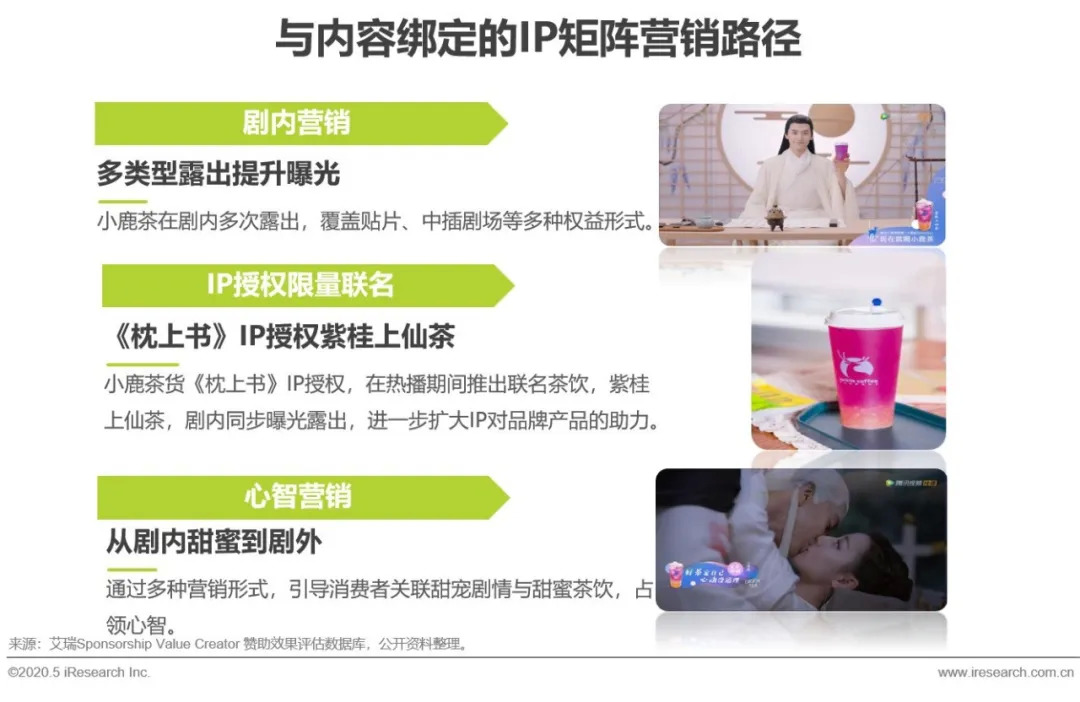 随着内容营销的升级,后疫情时期品牌主诉求从早前的剧内流量曝光,升级为可以延伸至营销端的全域覆盖,可以拓展至销售端的直接转化。《枕上书》X小鹿茶的案例在这两点上对行业做出了很好的示范,即通过内容IP在营销上实现内容在全域的流量助力,强交互,占领心智;且通过联名消费品的方式,实现对内容受众的精准转化。