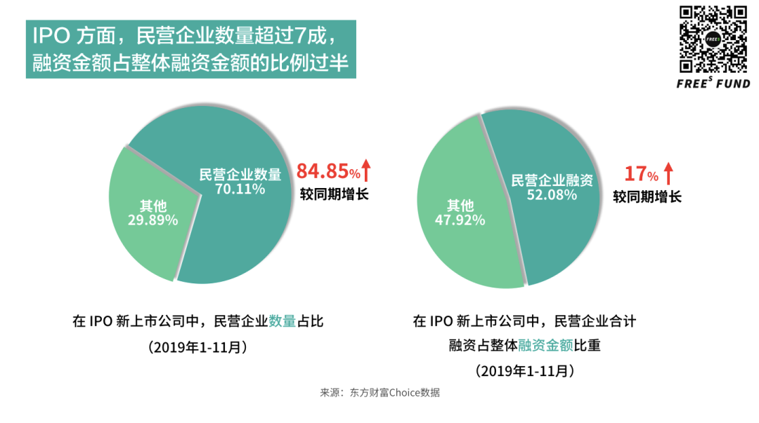 据时代商学院依据东方财富 Choice 数据统计发布的《2019 年 A 股上市公司 IPO 融资报告(1-11 月)》,企业融资金额方面,2019 年 1-11 月,174 家 IPO 新上市公司中,民营企业数量为 122 家,占整体新上市公司的比重为 70.11%。民营企业合计融资 1054.12 亿元,同比增长 124.53%;占整体融资金额的比重为 52.08%,较 2018 年 1-11 月(34.78%)增长约 17 个百分点。
