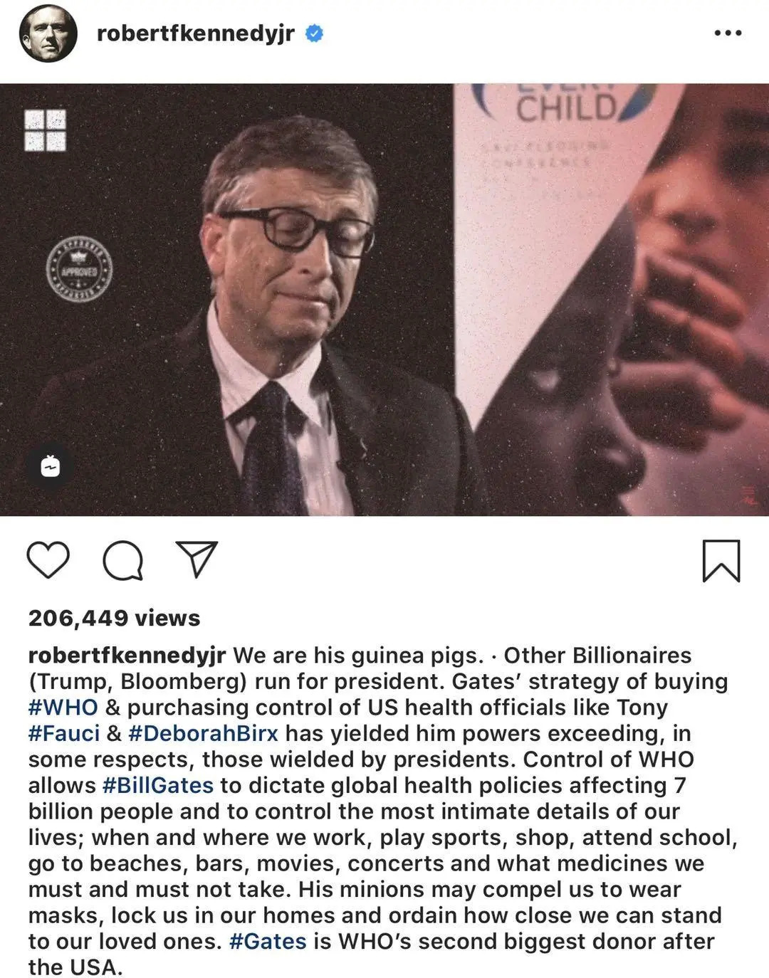 肯尼迪家族的Robert F. Kennedy Jr.一向坚定反对疫苗接种,3月以来他靠频频在社交媒体上黑化比尔·盖茨,Instagram粉丝数已增长一倍。