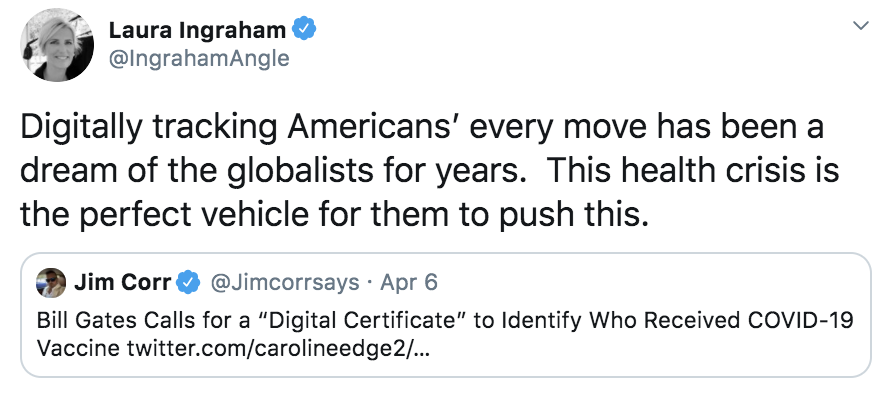 经后来美国媒体追溯,1月份在Twitter上最早把比尔·盖茨与新冠病毒联系到一起的发帖人,与另一个知名阴谋论“匿名者Q”(QAnon)关系密切。