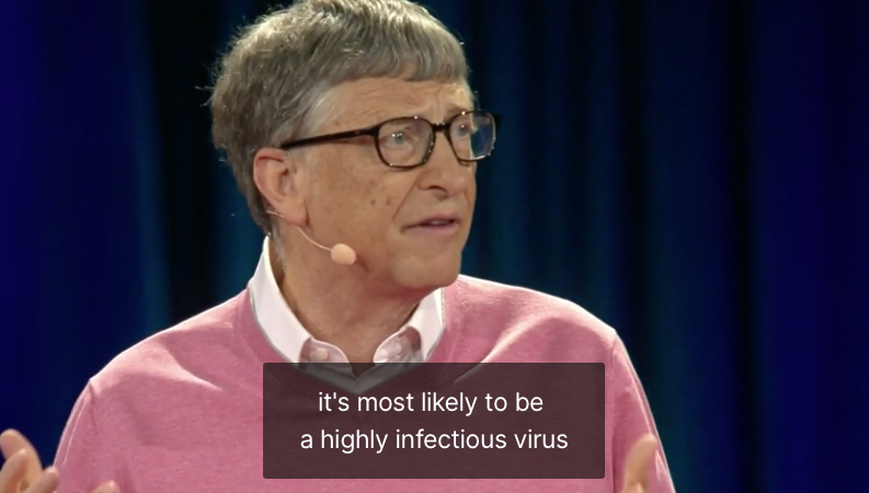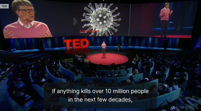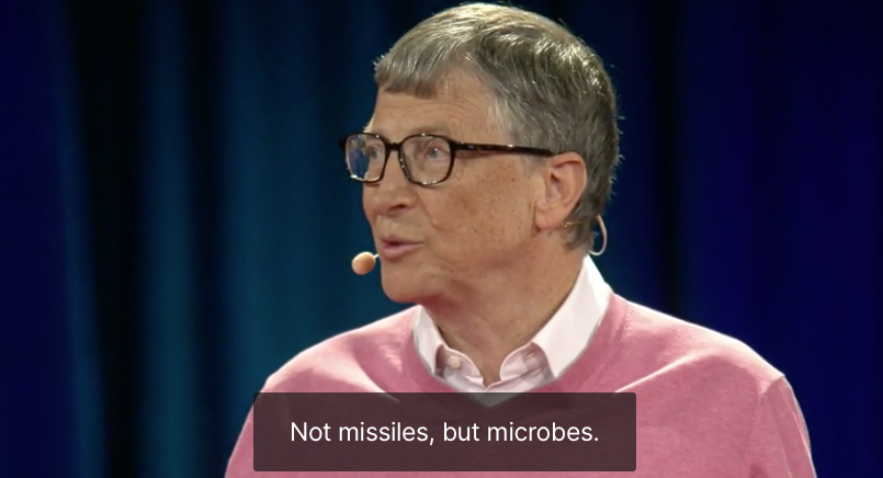 人类面临的最大风险不是核战争,而是可能威胁到数百万人生命的传染性病毒;各国政府缺乏防御设施,他呼吁建立国际预警和反应系统以应对大流行病的发生。