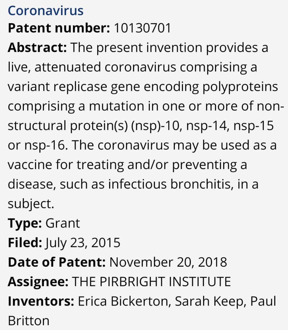 今年1月21日,一条暗示“比尔·盖茨早已知晓新冠病毒大爆发”的推文在Twitter上开始疯传,发帖人得到这个惊天结论的证据是英国Pirbright Institute研究机构在2015年获得的一项关于“新冠病毒”的专利。(Pirbright Institute是盖茨基金会的捐赠受益机构)