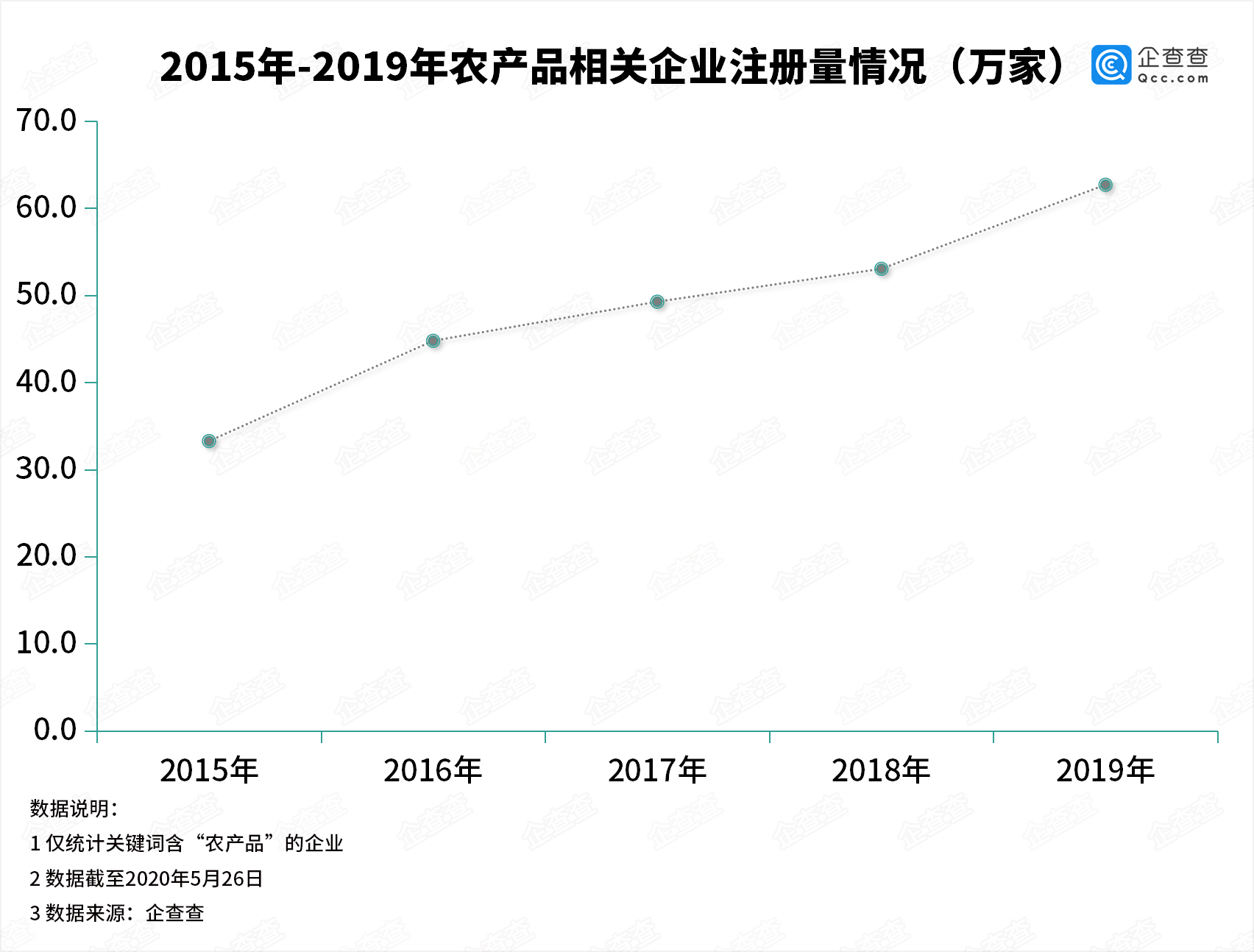 据企查查数据显示,全国范围内,农产品相关企业多达380万家,其中在业存续状态的企业数量为310万家。近五年来(2015年-2019年)农产品相关企业年均注册量维持在48万家。