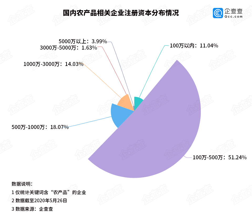 据企查查数据显示,农产品相关企业注册资本偏重资本模式,注册资本在100万以内的相关企业不足15%,相关企业主要集中在100万-500万这个区间,占比多达51.24%。