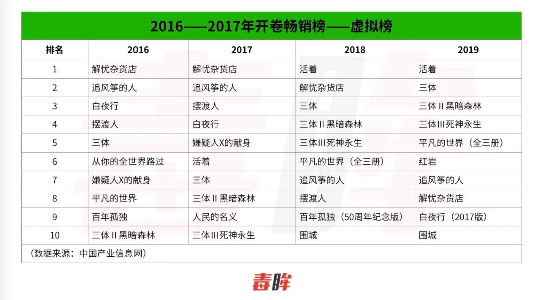 如果将讨论的时间维度拓宽,在国内的各大畅销书榜上,东野圭吾其实早就是常客了。中国产业信息网调查数据显示:2016-2019年间,东野圭吾早年作品《白夜行》《嫌疑人X的献身》《解忧杂货店》在国内虚构类书籍中,销量多次位居前10,且曾两次登顶。