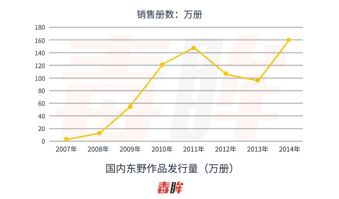 有调查数据显示,在2007——2014年这段时间内,东野圭吾作品在国内销量呈波动上升趋势。至2014年,东野圭吾作品在国内的销量已经突破160万。而到2017年,东野圭吾在中国内地已经发行了175部作品,发行量超过1900万册。
