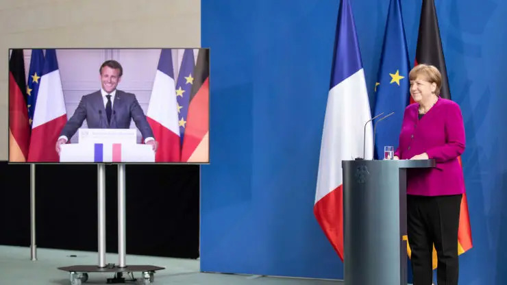 德国总理默克尔和法国总统马克龙在5月18日通过视频与媒体交谈。(图源:CNBC)