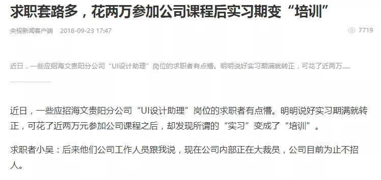 有公司打着高薪招聘应届生的旗号,然后刁难应届生经验不足、能力不足,要想得到offer,得先培训,或者从学徒做起。