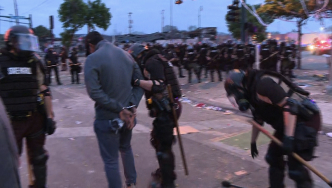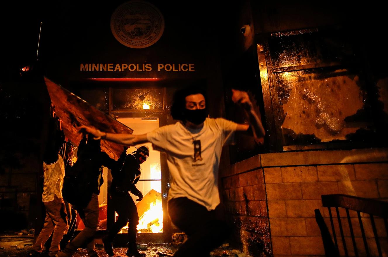 据《华盛顿邮报》报道,当地时间28日晚11时左右,警察撤离,随后抗议者冲入警察局,进行打砸,并放火焚烧。据警站内监控视频显示,示威人群穿过警站大厅,砸毁消防栓设施。警站外示威人群点燃火焰,用高声喇叭疾呼“没有公正、没有和平”。