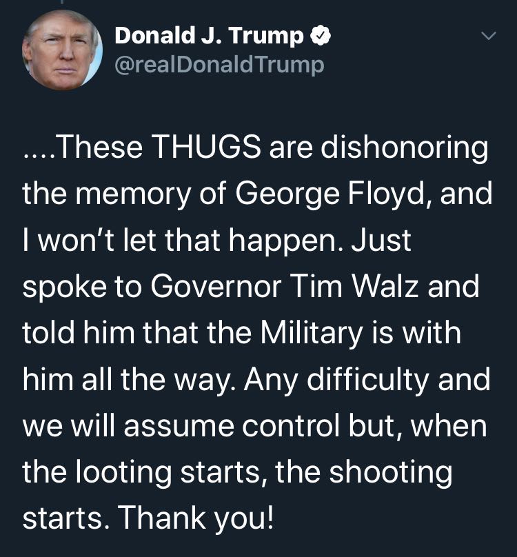 美国总统特朗普在社交网络发文称,他刚与明尼苏达州州长蒂姆·瓦尔茨 (Tim Walz)通话,表示军队会支持他,并威胁将对骚乱者动用武力。