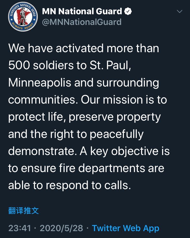 当地时间28日夜间,明尼苏达州国民警卫队宣布,已经调动了500多名士兵前往明尼阿波利斯市和周边的圣保罗市。“我们的使命是保护生命安全、保护财产和和平示威的权利。一个主要目标是确保消防部门能够及时响应。”