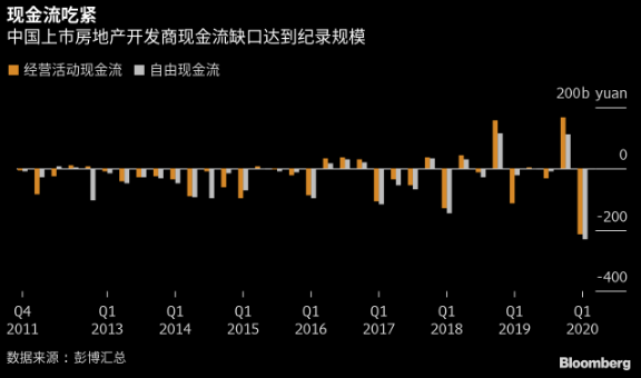 如上图,Bloomberg对110余家已公布一季报的上市地产公司财务指标汇总,今年一季度自由现金流总和约-2310亿元人民币,经营活动现金流总和约-2130亿元,均为2011年四季度彭博有数据以来的最差,两项数据分别是去年同期的逾11倍和接近两倍。