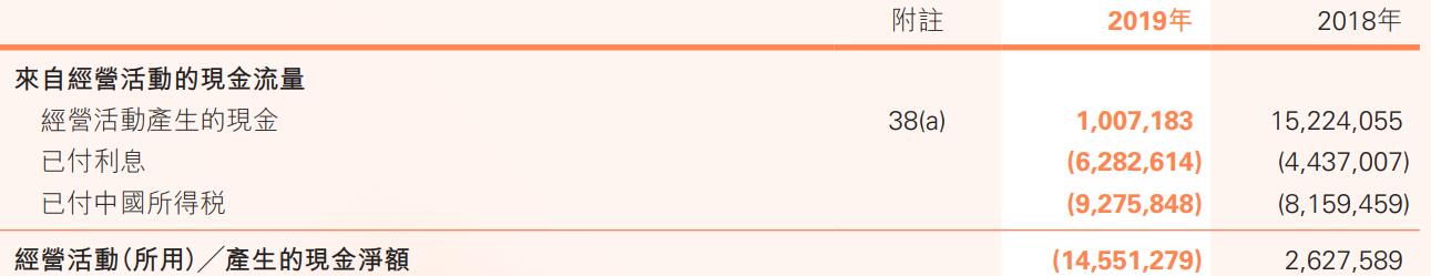 这份年报披露,在反映企业经营好坏的经营活动现金流方面,雅居乐情况不尽如人意。如下面截图所示,2019年,雅居乐经营活动产生的现金净额为-145.5亿元,2018年这一数据还为26.28亿元。