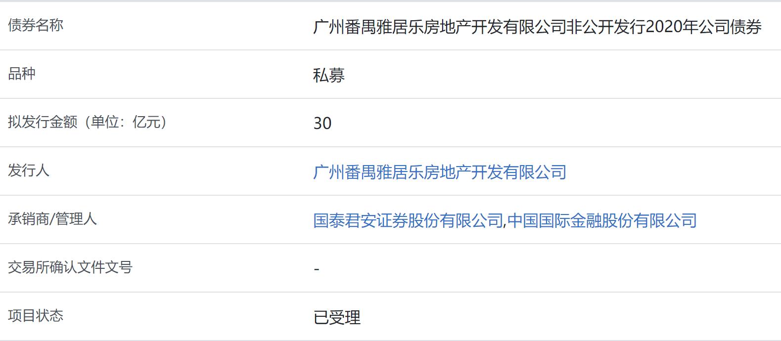 最新的消息是,雅居乐旗下广州番禺雅居乐房地产开发有限公司非公开发行2020年公司债券状态更新为“已受理”,涉资金额30亿元。这距离穆迪发公告下调其评级展望至负面刚过去一个多月。