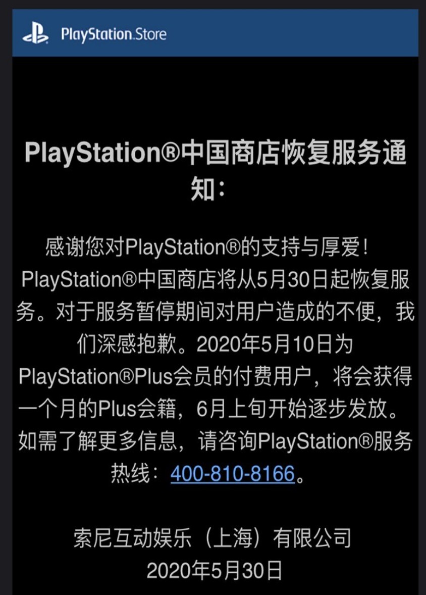 5月30日消息,根据用户收到的发自索尼互动娱乐(上海)邮件通知显示,PlayStation 中国商店将从5月30日起恢复服务。对于服务暂停期间对用户造成的不便,2020年5月10日为PlayStation Plus会员的付费用户,将会获得一个月个月的Plus会籍,6月上旬开始逐步发放。